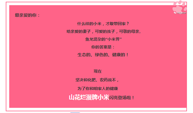為了咱家人的健康,興縣山花爛漫牌小米只施天然有機肥,決不讓一?;蔬M農(nóng)田,絕不使用殺蟲劑、除草劑,人工種植、人工除草、人工收割,24小時追溯系統(tǒng)管理,粒粒小米精選,高品質(zhì)的保證!